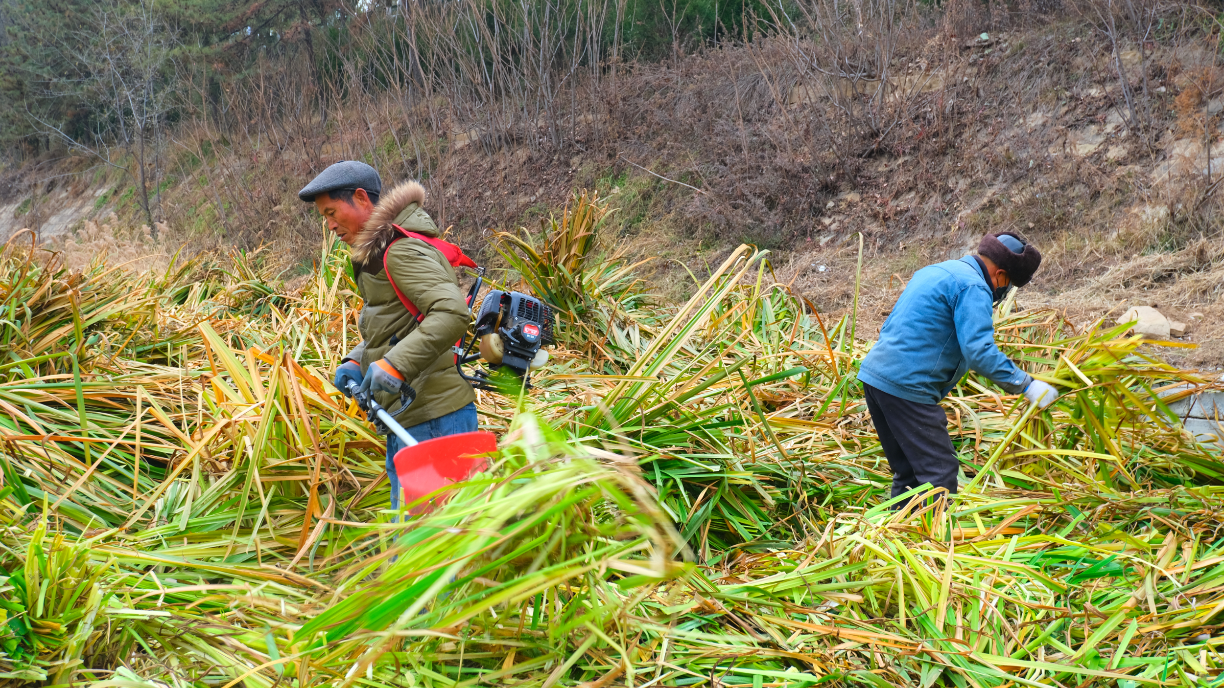 在陕西延安宝塔区阳柳桥湿地,菖蒲东倒西歪地躺着。前几天延安刚下了一场雪,雪花压倒了这些根系茁壮的植物,在它们的底部还残留着一小堆积雪。现在正值收割菖蒲的季节,记者跟随国家黄河中心“生态环境专家黄河行”调研组来到现场时,正看到两名工人在进行收割作业。