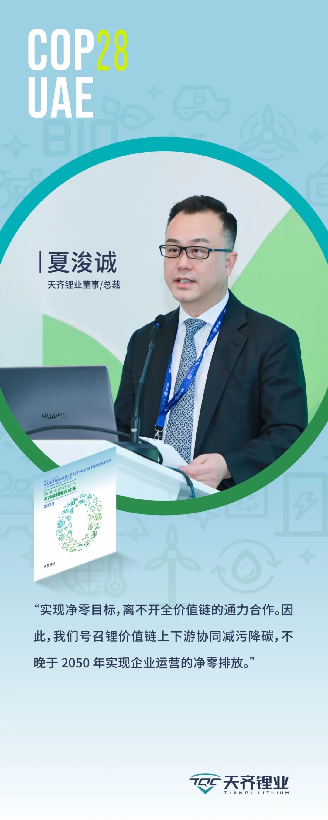 “实现净零目标,离不开全价值链的通力合作。因此,我们号召锂价值链上下游协同减污降碳,不晚于 2050 年实现企业运营的净零排放。” 在迪拜举行的《联合国气候变化框架公约》第二十八次缔约方大会(COP28)现场,来自天齐锂业股份有限公司诚挚地呼吁吸引了众多参会人士的关注。
