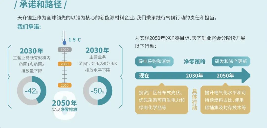 天齐锂业作为全球锂行业的重要成员,从 2018 年开始建立碳排放数据库,并于 2020 年全面启动系统性碳管理工作。目前天齐锂业已搭建境内外工作协调机制,完成了组织层面碳盘查以及产品层面碳足迹 LCA 评价工作。天齐锂业董事、总裁夏浚诚先生在COP28上表示,我们欢迎全行业以及全球各界伙伴积极加入净零倡议中,一起共创锂想,迈向净零未来。